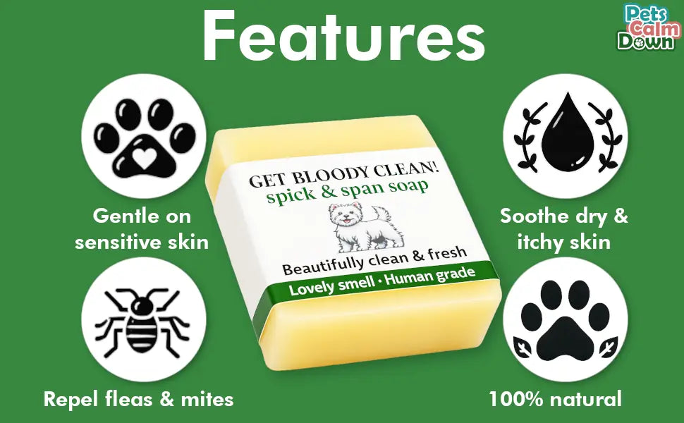 "Lovely shampoo soap that really works! My dog’s coat is so soft and smells amazing now. Before, he always had that doggy smell - completely gone! Coat looks shiny, skin is calm, and I love that it’s natural and gentle. 100% recommend."