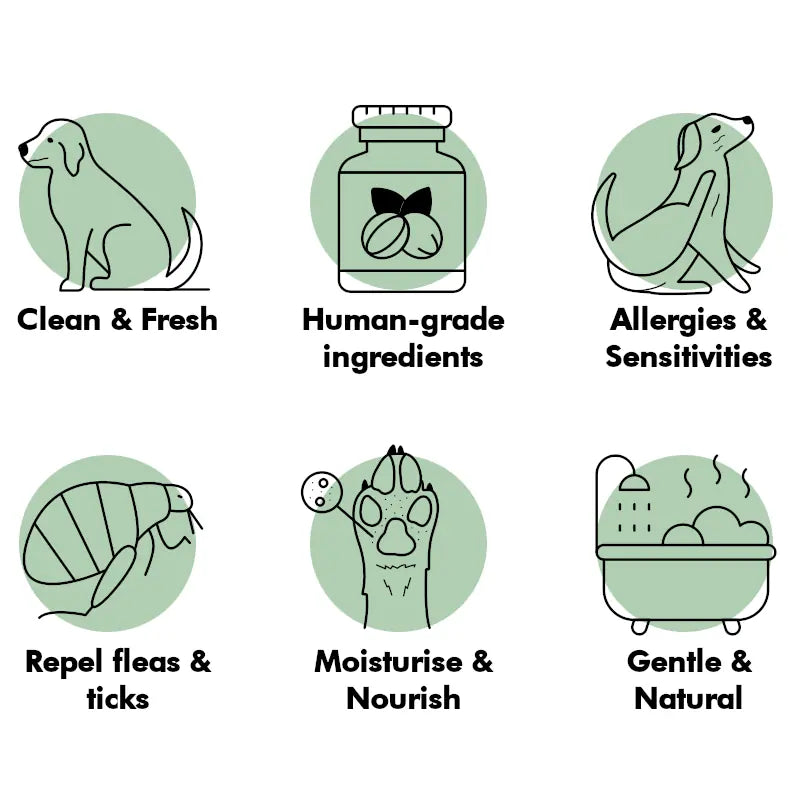 Coconut oil Natural cleanser that helps to remove dirt and odours from your dog’s coat. It also moisturises the skin, supports healthy fur, and has soothing properties that can help with itchiness. |